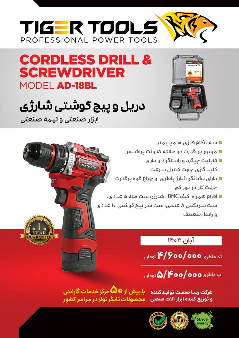 دریل پیچ گوشتی شارژی تایگر تولز مدل AD-18BL دارای موتور پرقدرت 18 ولت براشلس (بدون زغال) است که به عمر طولانی‌تر و کارایی بیشتر کمک می‌کند. این دستگاه با یک باتری لیتیومی 18 ولت طراحی شده و امکان شارژ سریع و عمر طولانی را فراهم می‌آورد. سه نظام فلزی آن با قطر 10 میلی‌متر، دوام بالا و قابلیت نگهداری بهتر مته‌ها را تضمین می‌کند. این دستگاه دارای قابلیت چپ گرد و راست گرد، گیربکس دو سرعته، نمایشگر میزان شارژ باتری، و کنترل سرعت به صورت کلید گازی میباشد. همچنین، با داشتن چراغ قوه روی بدنه و لوازم مصرفی شامل مته، سری پیچ‌گوشتی و رابط انعطاف‌پذیر، آن را به ابزاری کامل و کارآمد برای انجام انواع کارهای سوراخ‌کاری و پیچ‌کردن در مواد مختلف تبدیل کرده است. طراحی ارگونومیک آن نیز راحتی در استفاده و افزایش در راندمان را فراهم می‌آورد. این دستگاه با 21 حالت تنظیم پیچش ، برای پیچ‌های ظریف و حساس که نیاز یه چرخاندن با قدرت کمتری دارند یا برعکس، با استفاده از گشتاور‌سنج روی این دستگاه می‌توان فشار گشتاور (پیچاندن) را تنظیم نمود. این کار باعث جلوگیری از بریدن پیچ و یا خورده شدن گل (سر) پیچ می‌شود. این دستگاه دارای لامپ LED جهت کار در محیط‌های تاریک می‌باشد.