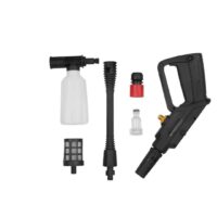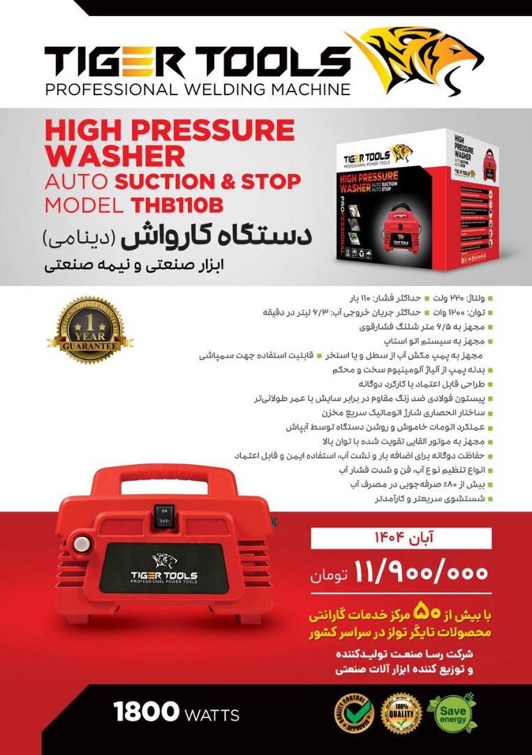 دستگاه کارواش تایگر تولز مدل THP110B یک کارواش 110 بار دینامی 1200 واتی است که جدا از قابلیت وصل شدن به شیر آب مستقیم ،قابلیت مکش و مکندگی را نیز دارد اگر شما قصد خرید یک دستگاه کارواش تمام عیار و با کیفیت را دارید پیشنهاد تیم کارشناسان فنی تایگر تولز به شما کارواش دینامی تایگر تولز مدل THP110B میباشد اگر بخواهیم به بررسی مشخصات این محصول بپردازیم باید در ابتدا به قابلیت مکش از منبع، استخر و چاه اشاره کنیم که علاوه بر آن قابلیت سمپاشی و کفپاشی را نیز دارد .موتور این دستگاه دینامی و 100 درصد از مس است و دارای توان 1200 وات است و توان خروجی این کارواش 110 بار واقعی میباشد و قابلیت کار با آبگرم تا دمای 60 درجه را دارد و حداکثر جریان خروجی آب این دستگاه 6.3 لیتر در دقیقه است که به این واسطه تا 80% در مصرف آب صرفه جویی میکند . این محصول مجهز به موتور القایی تقویت شده با توان بالا و همچنین شارژ اتوماتیک مخزن می باشد. بدنه دستگاه از الومینیوم سخت و مجهز به 6/5 متر شلنگ فشار قوی می باشد.حداکثر خروجی آب 6/3 لیتر در دقیقه بوده و مجهز به سیستم اتواستاپ می باشد. مجهز به عملکرد اتومات خاموش و روشن کردن دستگاه توسط آب پاش و حفاظت دو گانه برای اضافه بار و نشت آب می باشد.